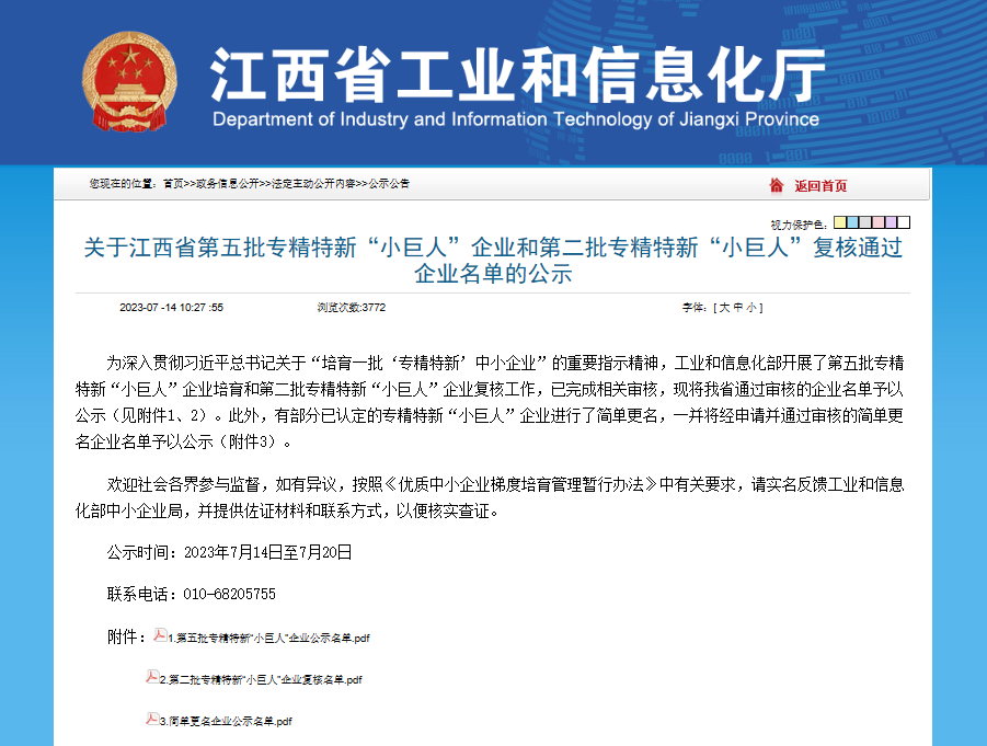 近日(ri),江(jiang)西省工信廳(ting)對國家工信部審核通過的第五批(pi)專(zhuan)精特新(xin)“小(xiao)(xiao)巨人”企(qi)業(ye)名單進行了公示,江(jiang)西憶源多媒(mei)體科技(ji)有限公司(si)榮(rong)膺國家級專(zhuan)精特新(xin)“小(xiao)(xiao)巨人”企(qi)業(ye)稱號。
