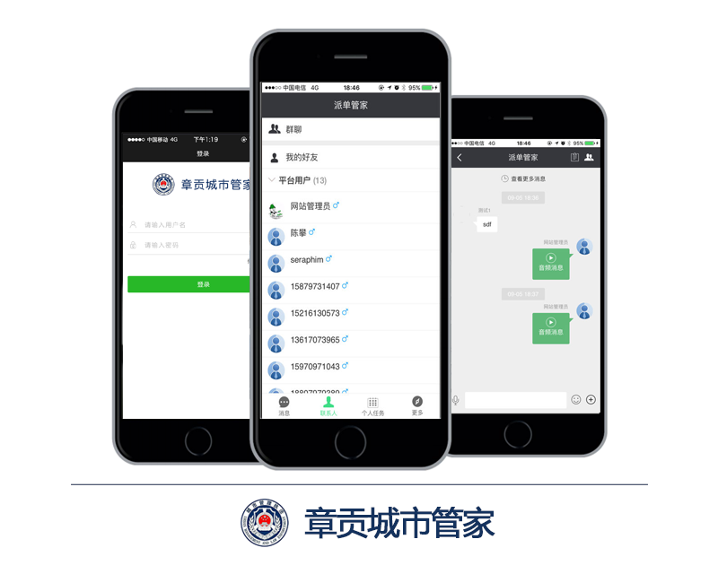 由城管巡(xun)檢人(ren)員(yuan)使用,接收來自(zi)調度中心(xin)的派單(dan),根(gen)據(ju)標(biao)記(ji)的地(di)址前往問題(ti)地(di)點(dian)處理和(he)整(zheng)改問題(ti)。提供即時通信功(gong)能以供城管人(ren)員(yuan)還有調度人(ren)員(yuan)之間的溝通,除此之外,還有修(xiu)改頭像和(he)修(xiu)改登錄密碼,查看版本(ben)信息等功(gong)能。